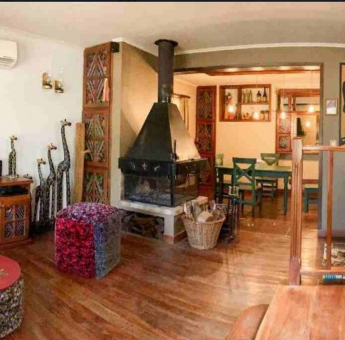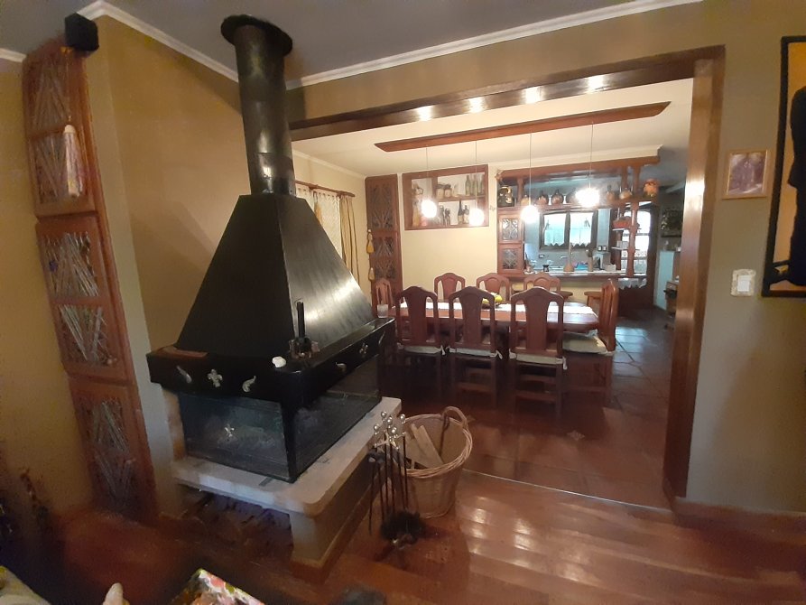 Hermoso living de 4,4x4,9mt con hogar a leña central abarcando living y comedor. Vistas al jardín frontal.